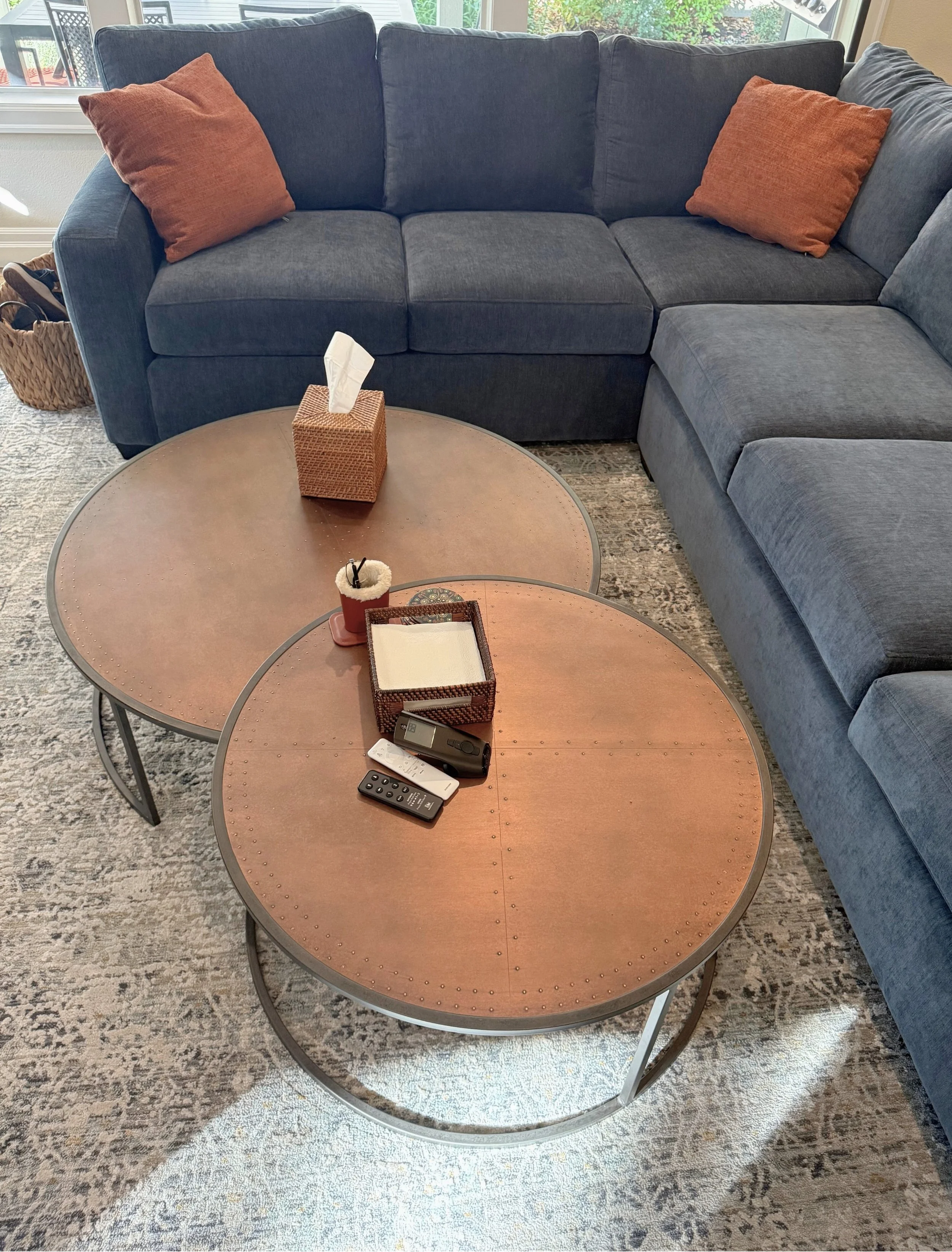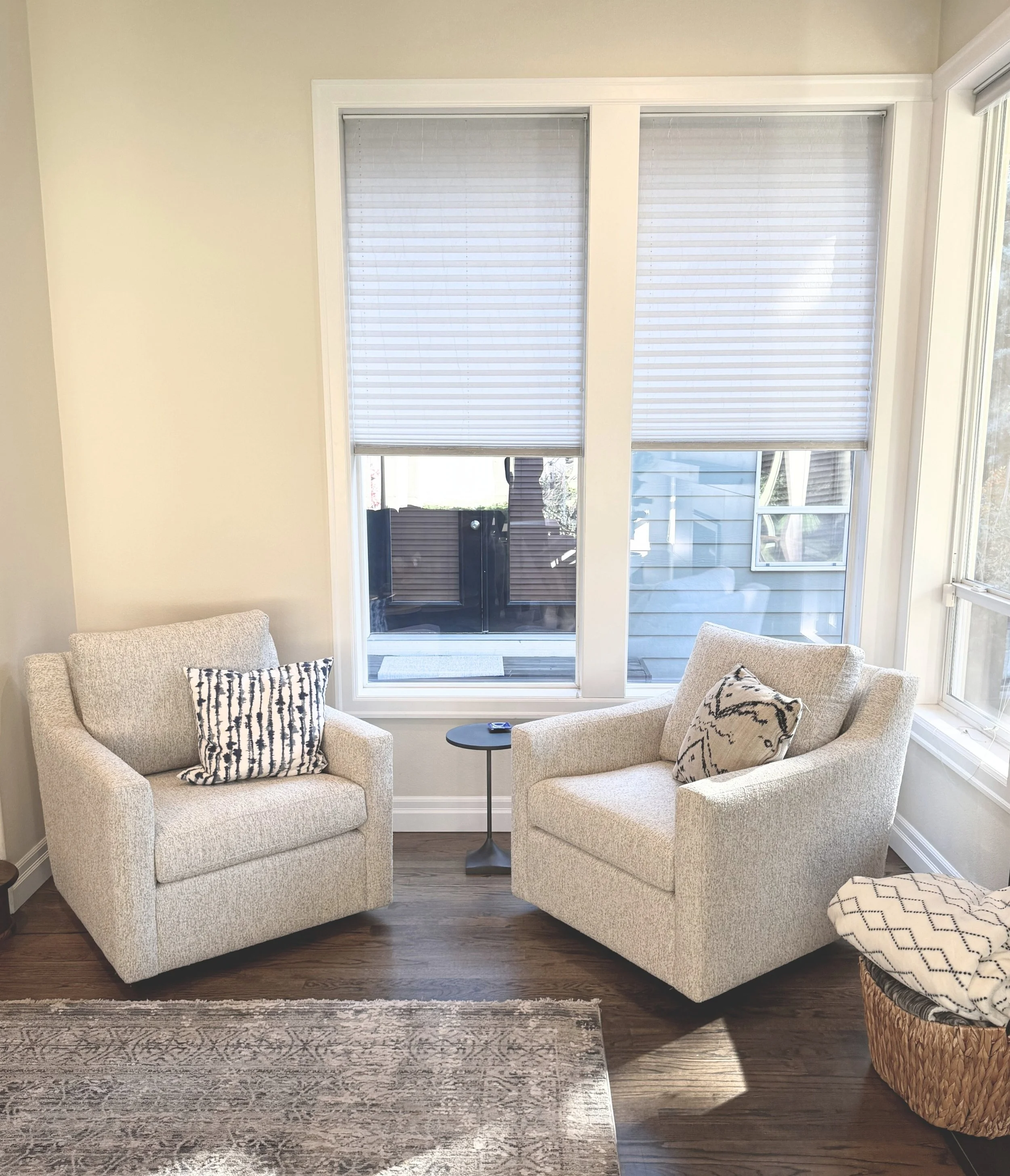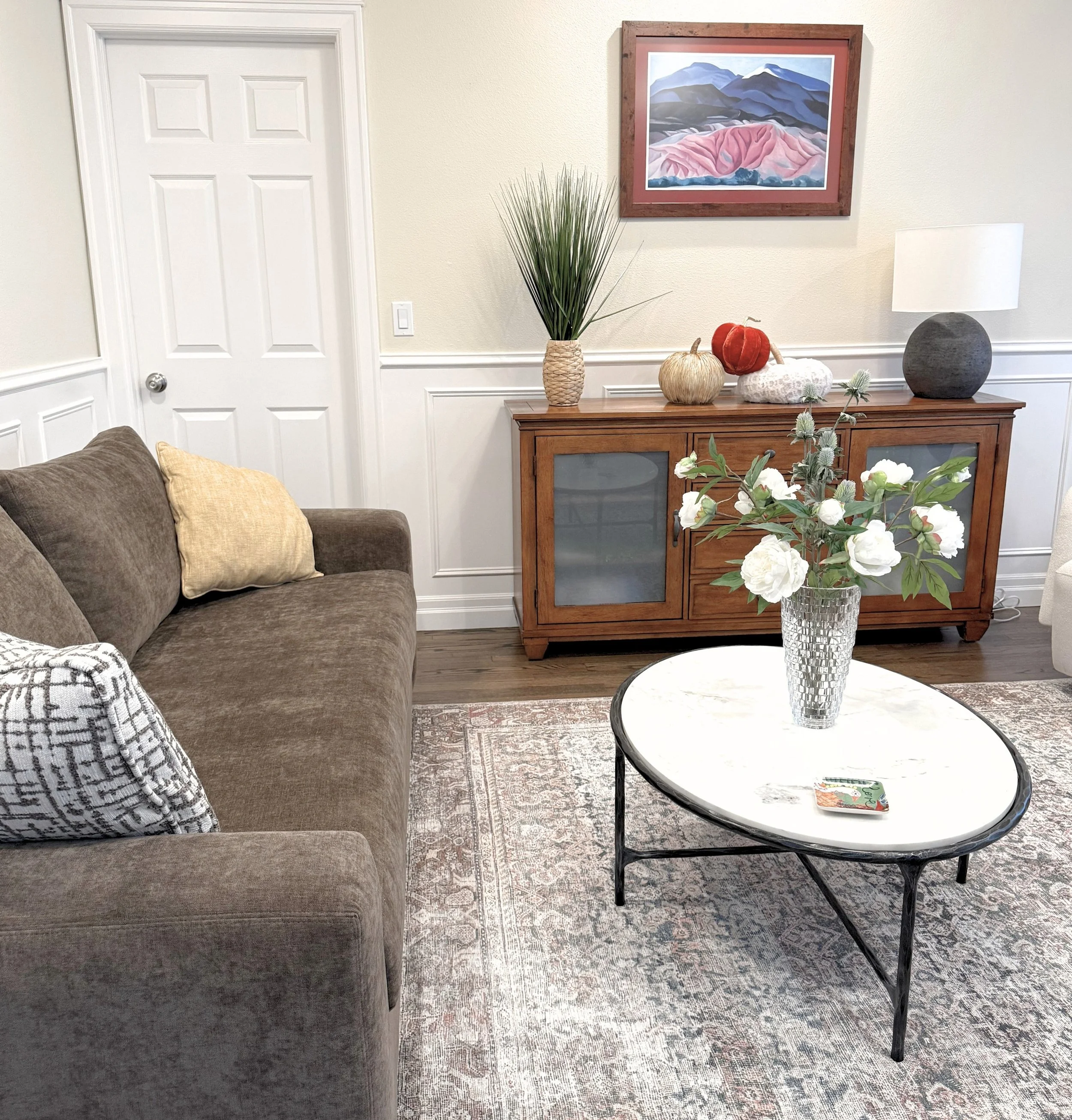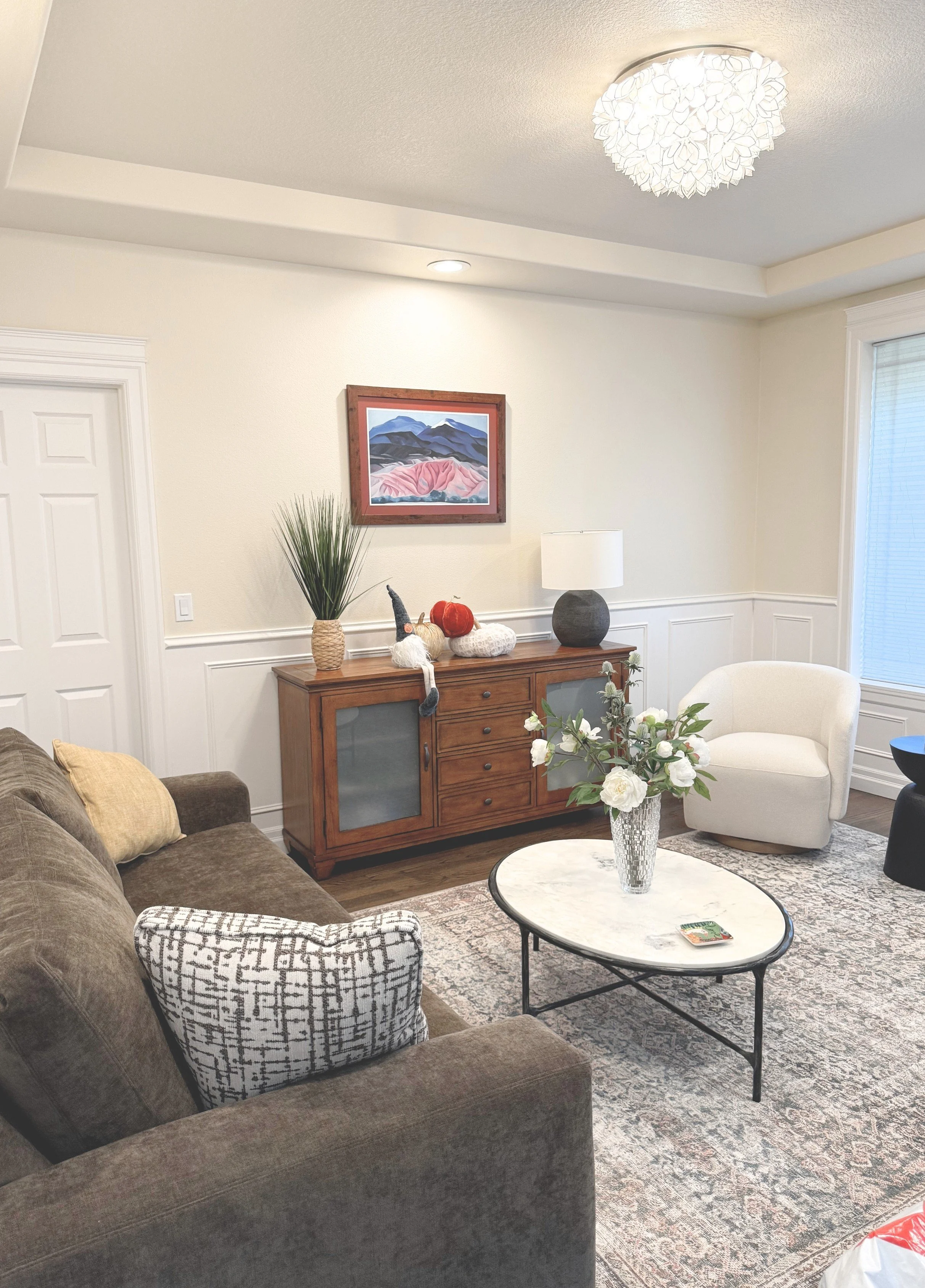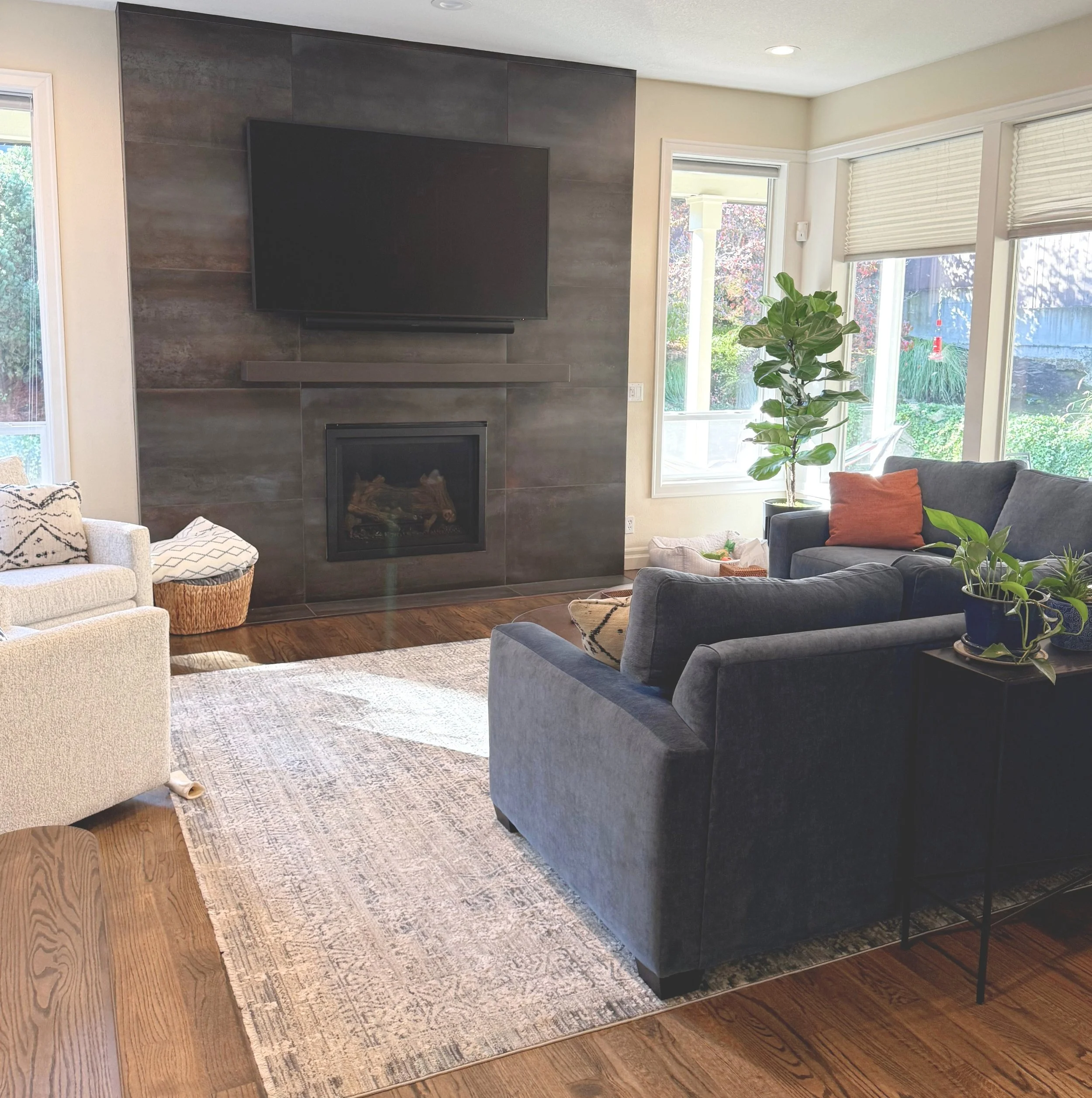 For this design consultation, I helped a couple transform their newly purchased Washington home into a space that felt both modern and reflective of their personal style. The main living area was anchored by a redesigned fireplace, replacing a traditional wainscoted surround and brown granite face with a streamlined concrete-look finish and modern mantel to create a clean architectural focal point. We selected a deep ocean blue sectional with tailored track arms, accented by burnt orange pillows that complement the antiqued copper Catalina nesting tables, while oversized cream swivel gliders created an inviting secondary seating nook. In the formal living room, a brown chenille track arm sofa, neutral swivel chairs, and a sculptural marble oval coffee table established a balanced, sophisticated foundation, enhanced by a statement flush mount at the tray ceiling. Fresh neutral paint brightened the space, and we thoughtfully integrated the clients’ existing casegoods with subtle updates, layering in plants and decor to create cohesive, welcoming rooms that feel both elevated and personal.