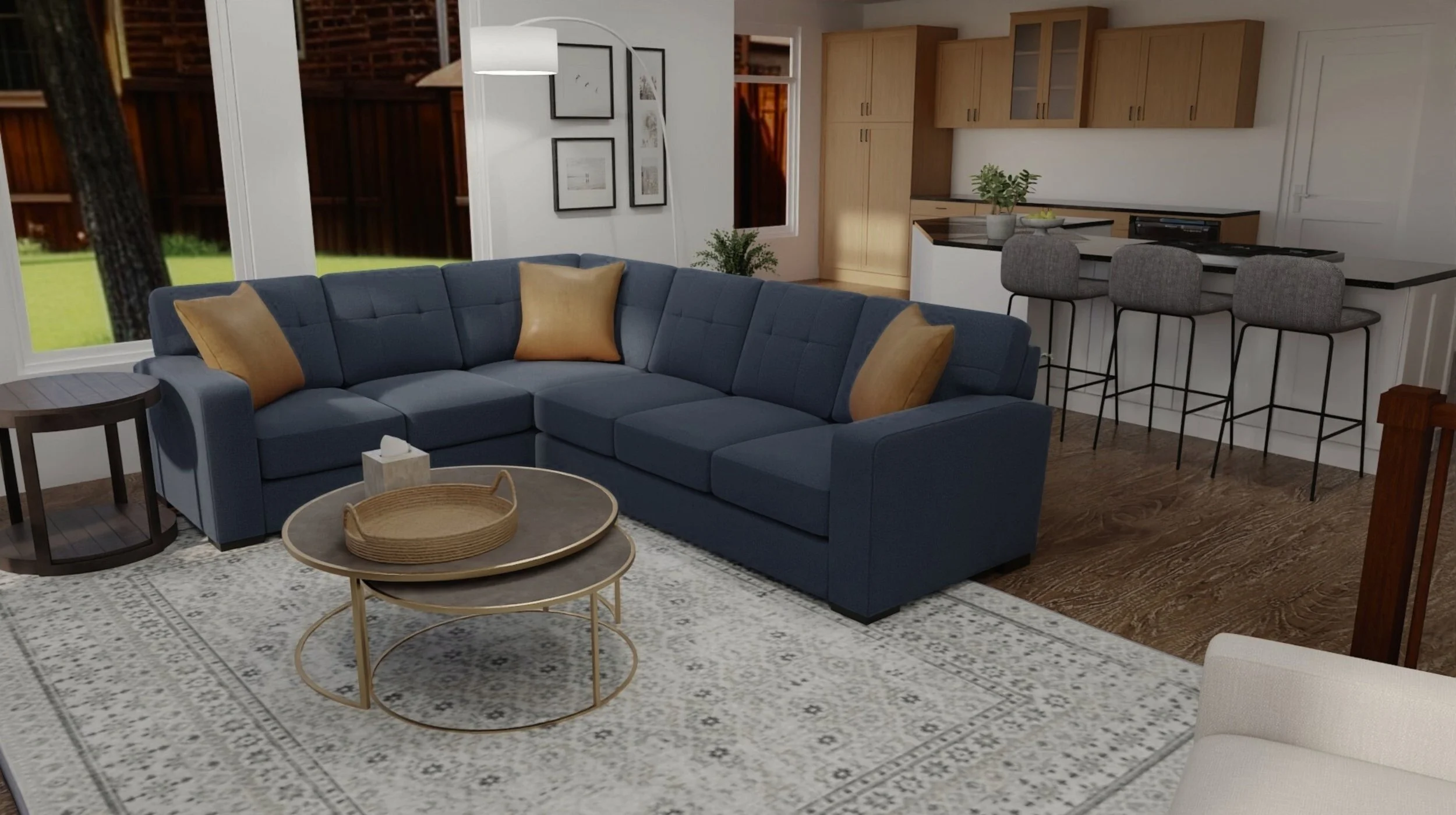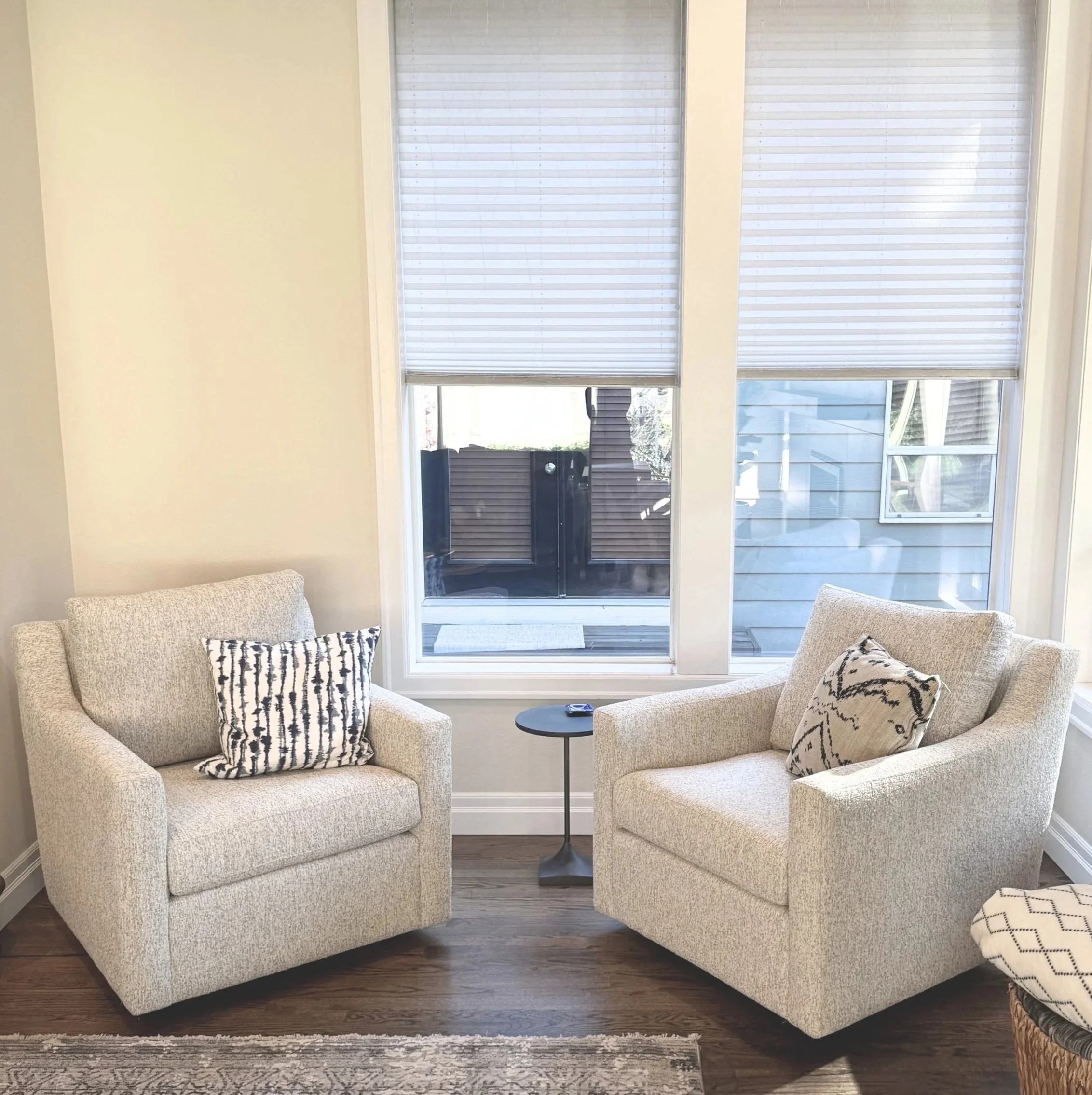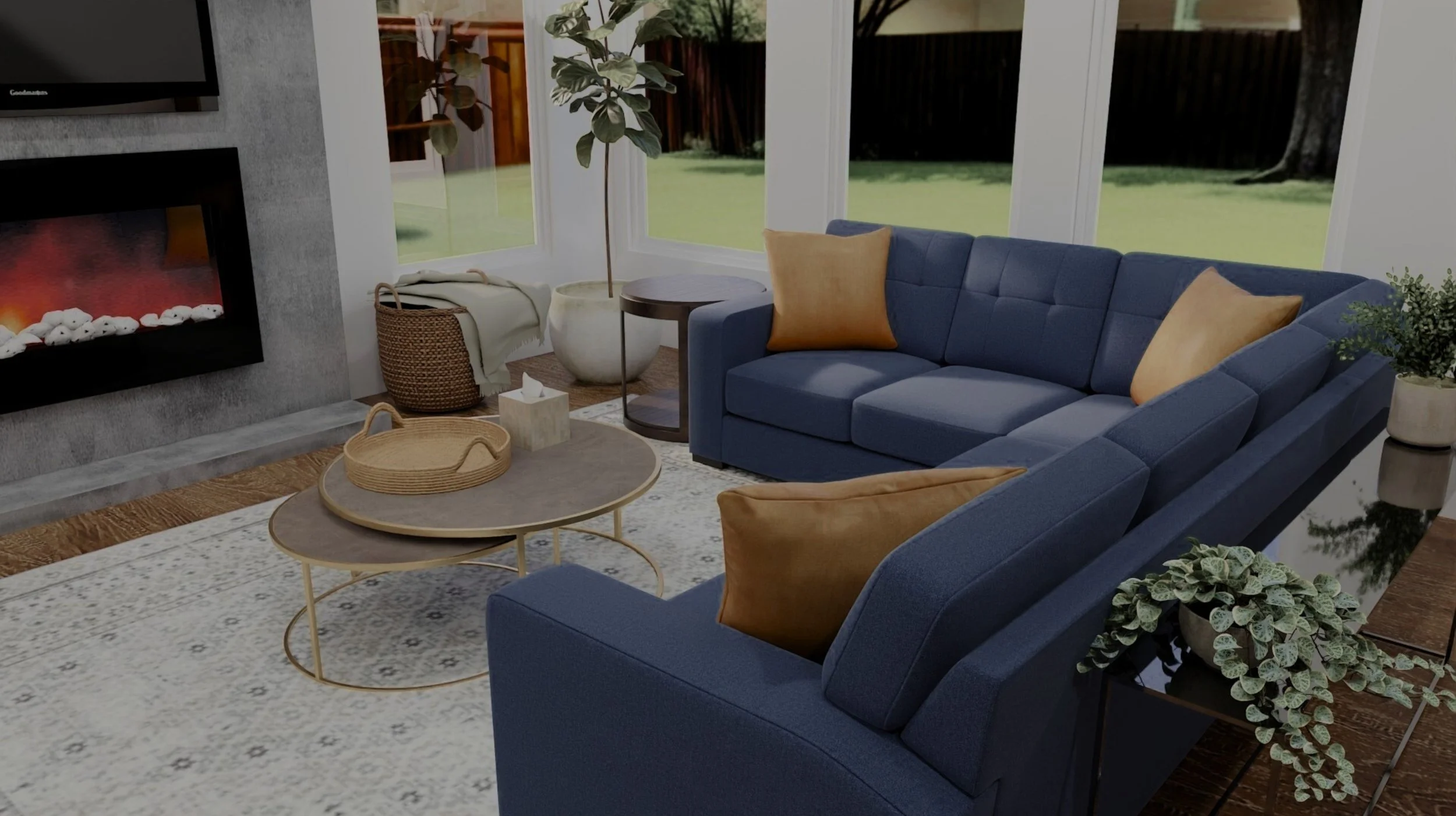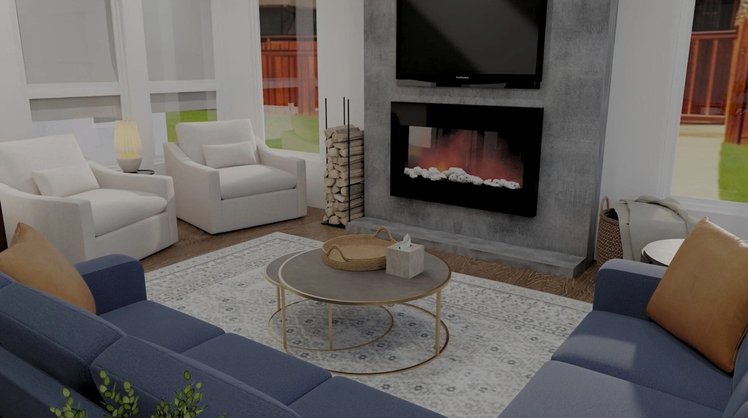 For this design consultation, I helped a couple transform their newly purchased Washington home into a space that felt both modern and reflective of their personal style. The main living area was anchored by a redesigned fireplace, replacing a traditional wainscoted surround and brown granite face with a streamlined concrete-look finish and modern mantel to create a clean architectural focal point. We selected a deep ocean blue sectional with tailored track arms, accented by burnt orange pillows that complement the antiqued copper Catalina nesting tables, while oversized cream swivel gliders created an inviting secondary seating nook.